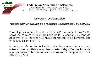 Para el sábado 2 de abril se convoca reunión de la Delegación Sevillana de Atletismo con los Clubes, Entrenadores, Jueces y Atletas adscritos a esta delegación provincial.